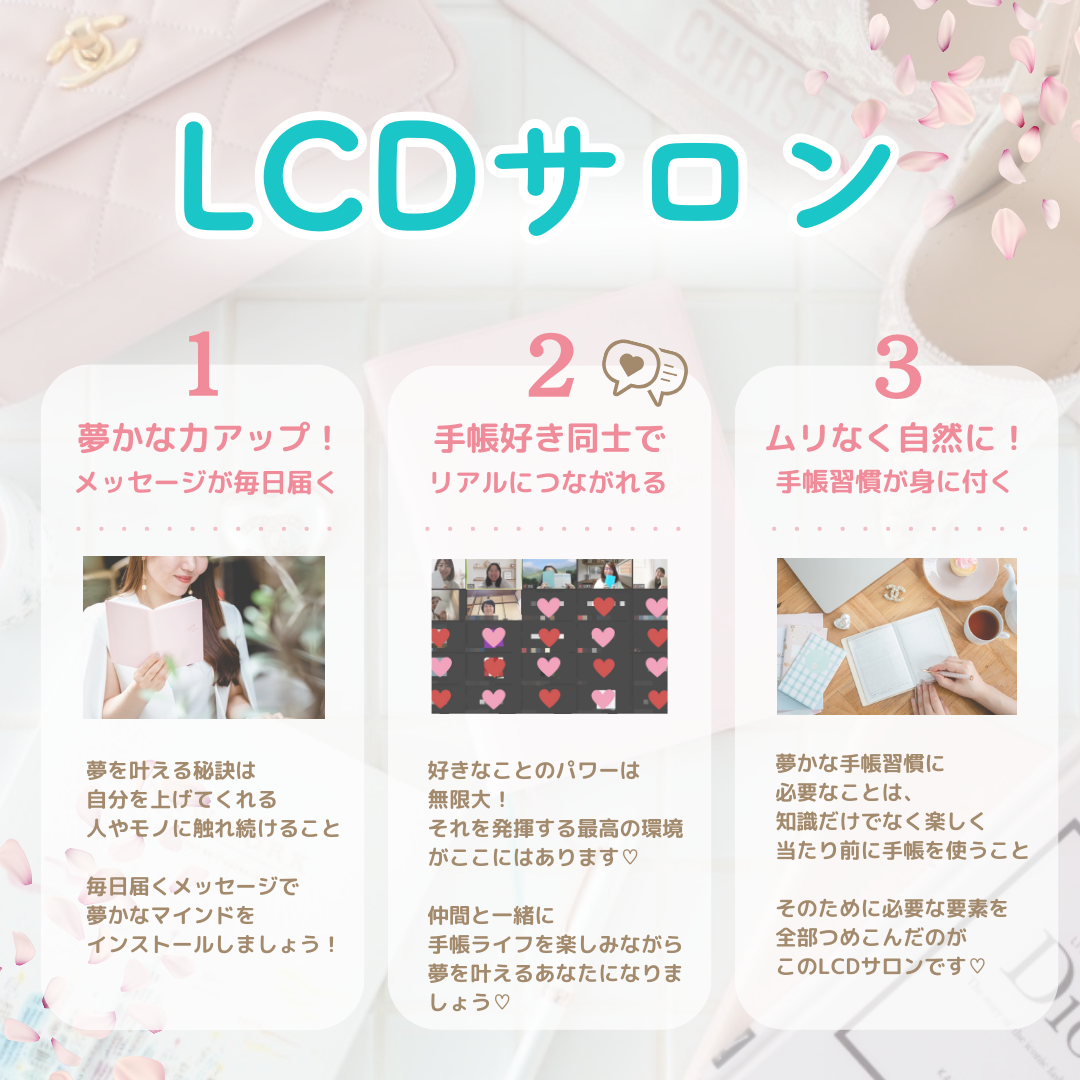 LCDサロンでは、運営メンバー3人を中心に夢を叶える専門家アジェンディストたちが手帳を使ってあなたの夢を叶えるサポートをします。