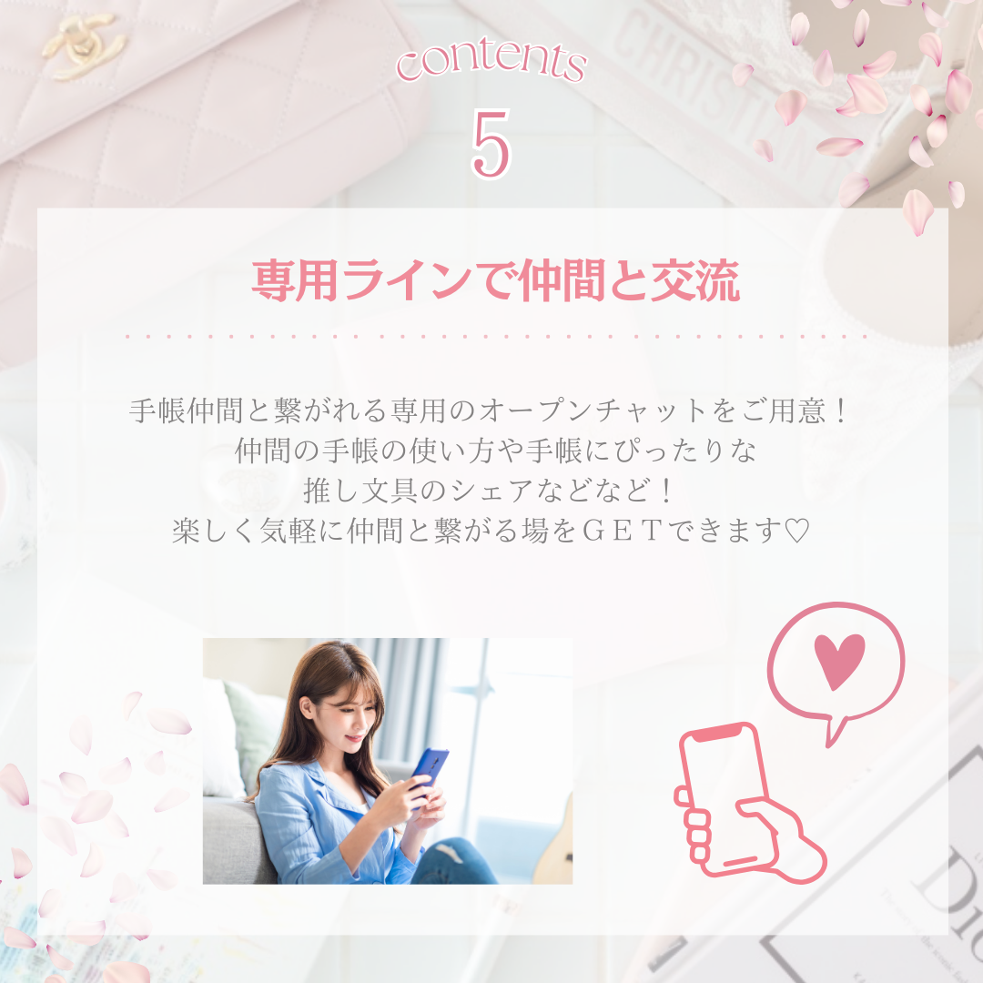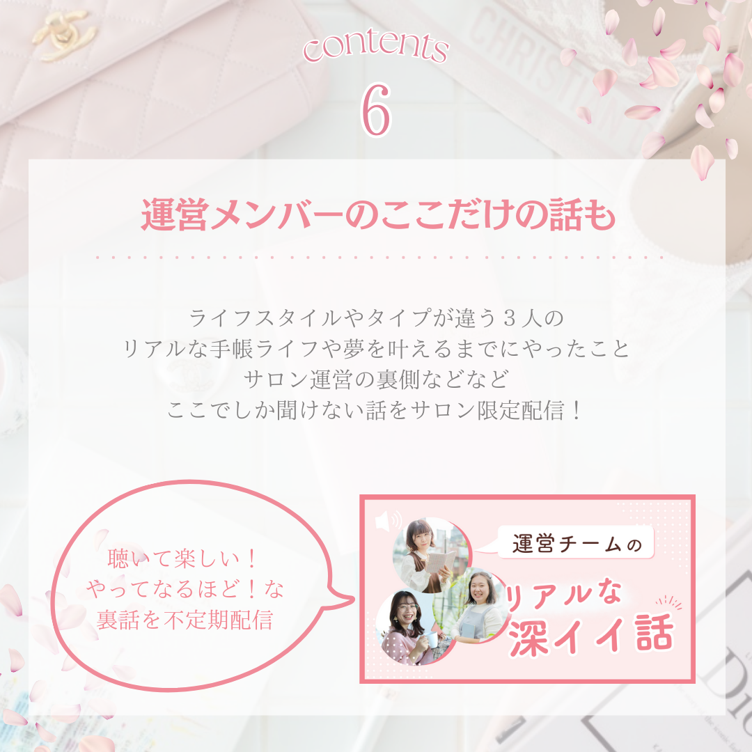 通常は非売品のスペシャルワークシートを、メンバーさん限定でプレゼント! 手帳に入れ込めるサイズのワークシートを活用して、ますます理想を叶えていきましょう♡ |