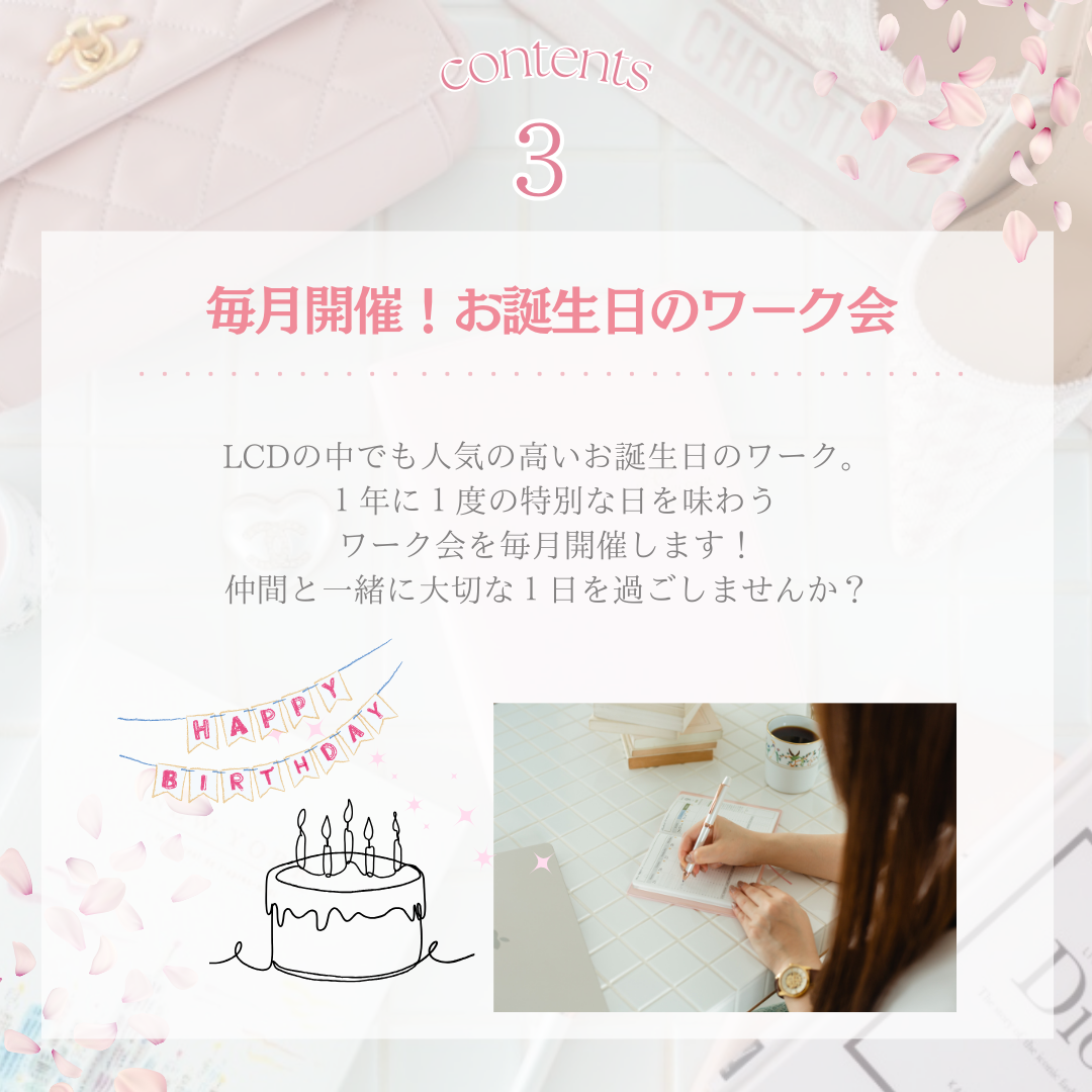 3、新しい知識やアイデアが手に入るLCDサロンでは、定期的なワーク会や交流、イベントを通じて、あなたの成長をサポートします。